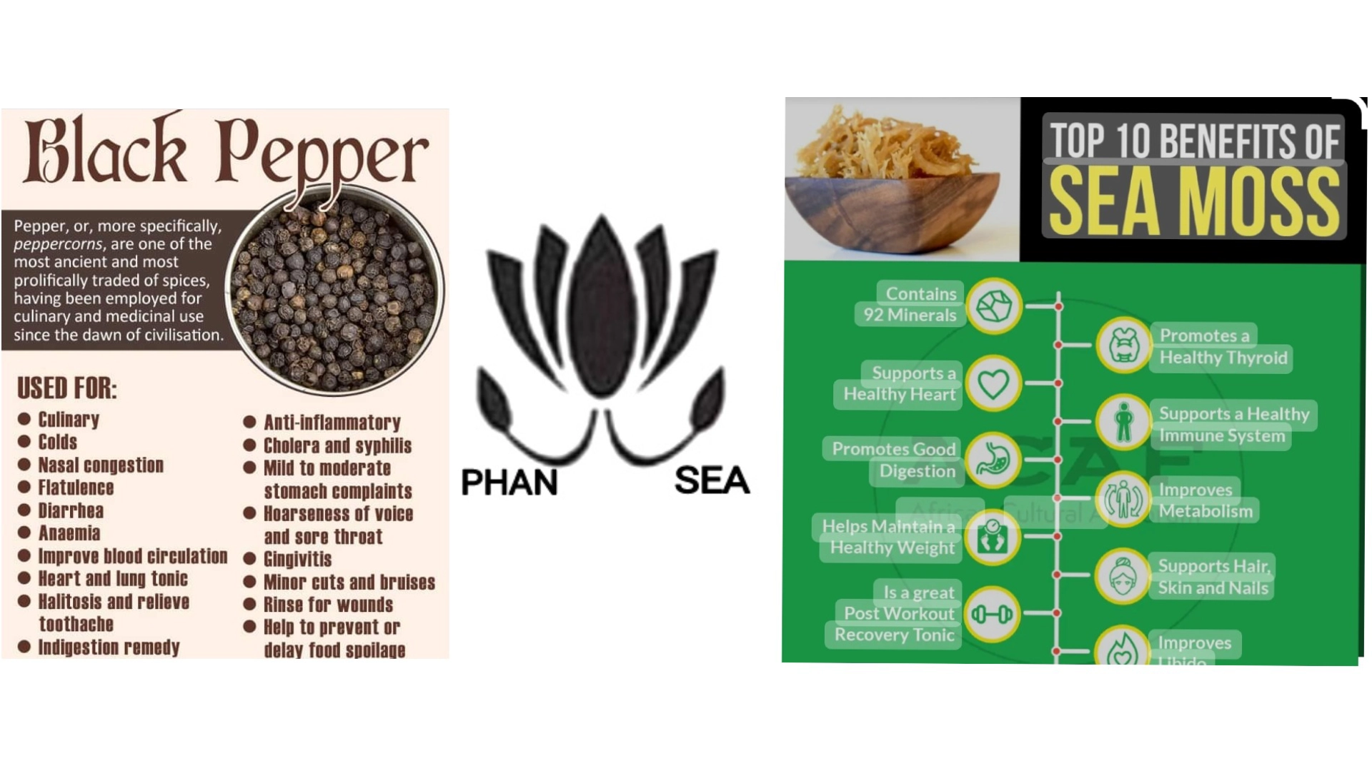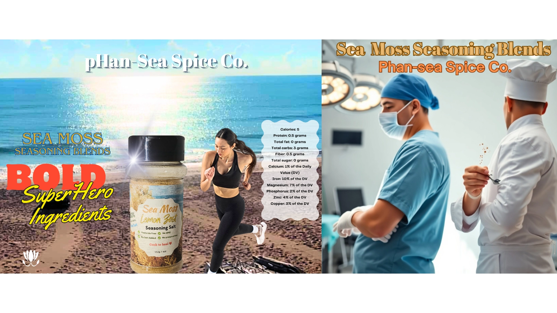 Thank you for choosing pHan-Sea Spice Company. The natural way to cook and eat to nourish the body is to heal using nature's medicine to heal our selfs. Sea Moss is the Ocean's multipurpose medicine with over 92 vitamins and minerals of the 102 properties needed for human function. Sea Moss can be used in many forms. We have created several seasonings, combined with your common household spices that can be used daily in all your cooking dishes such as meats, fish, vegetables, sprinkled in soups, salads and even mixed in your favorite hot or cold drinks. We hope that you enjoy our collection of selected premium Sea Moss seasonings blends for your healing journey. (Now added to our line of healthy products Sea Moss gels and Tea's..)